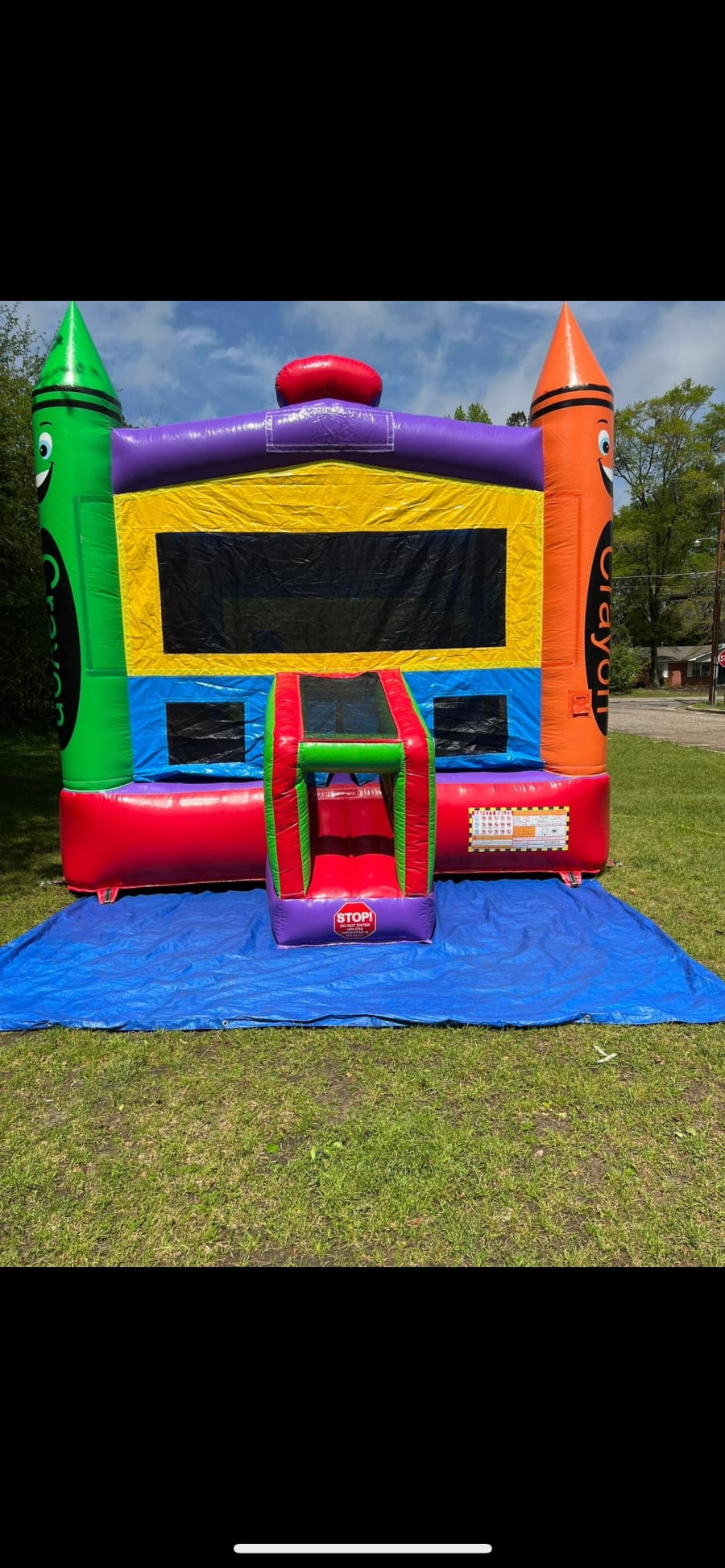 Our colorful Crayon Bounce House is the perfect additional for any kids party or recreational event. It is COLORFUL, FUN, and AFFORDABLE. Your kids will have a great time bouncing and playing. This inflatable has an indoor playground that has a basketball hoop and pop ups.